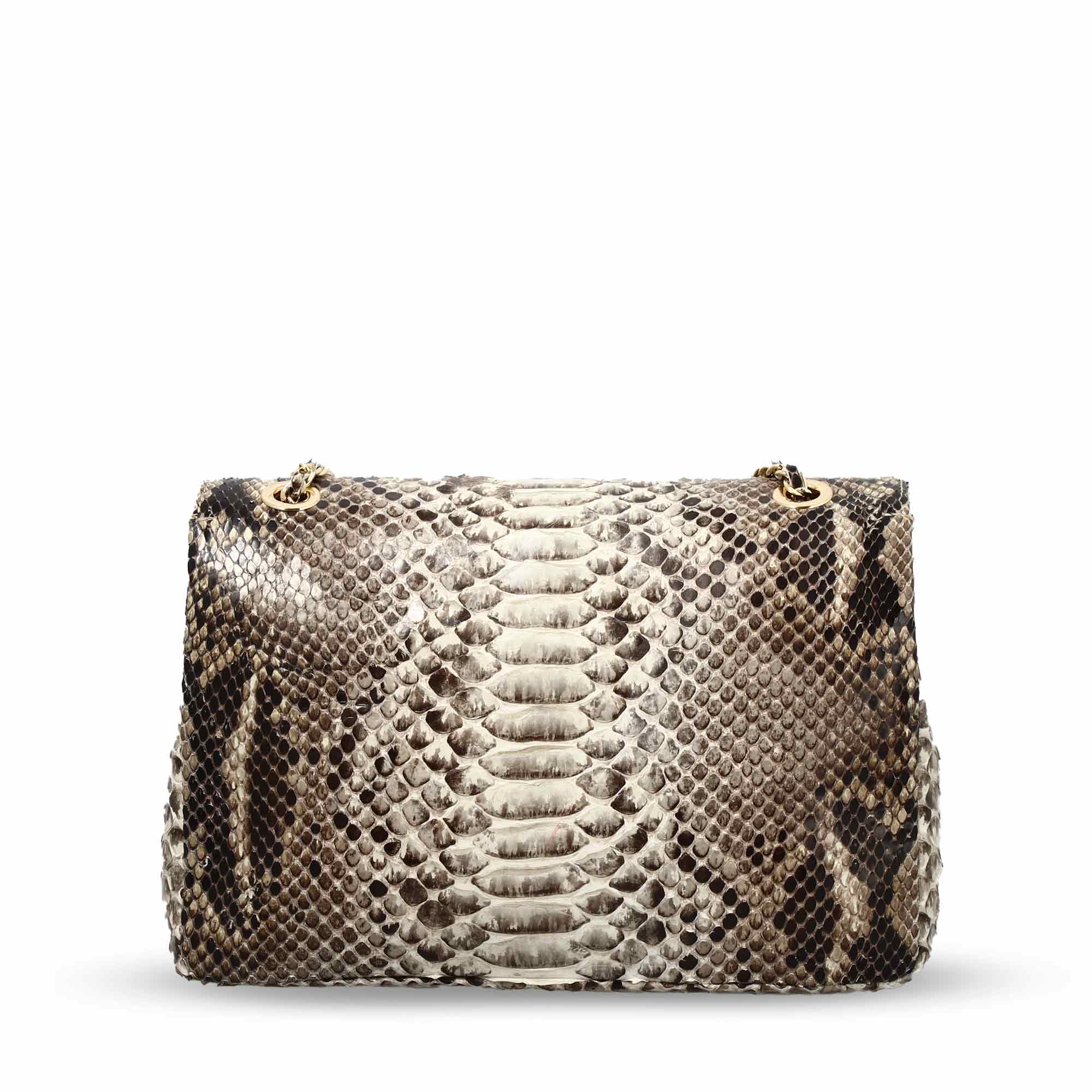 Borsa a spalla da donna in pelle di pitone panna e marrone.
