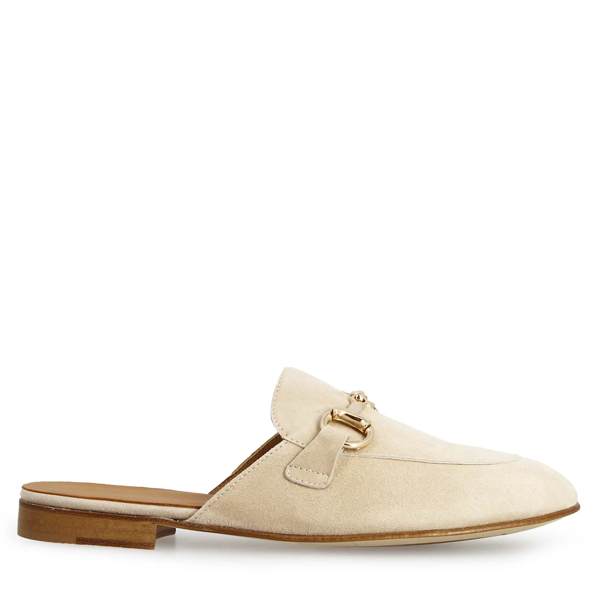 Sabot da donna in pelle scamosciata beige con fibbia oro