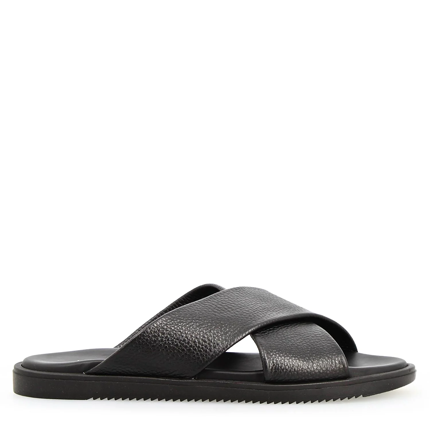 Il sandalo Orfeo Nero da uomo esprime un equilibrio naturale tra comfort e materia pregiata. Realizzato in pelle bottalata nera, si distingue per morbidezza, elasticità e una texture autentica che valorizza la linea della calzatura.