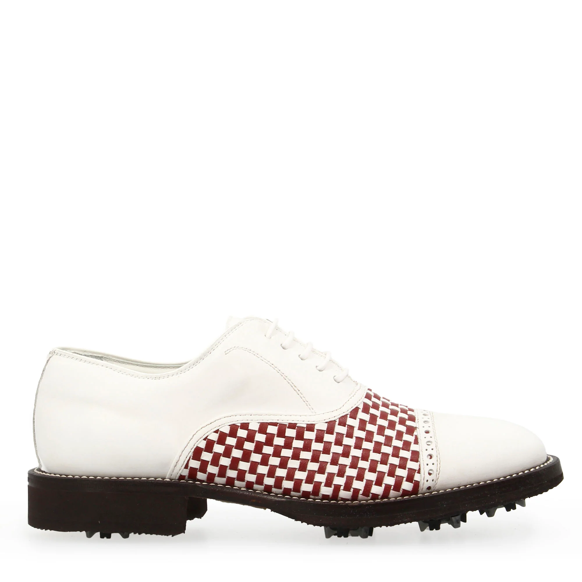 Scarpe classiche da golf artigianali in pelle bianca e rossa intrecciata
