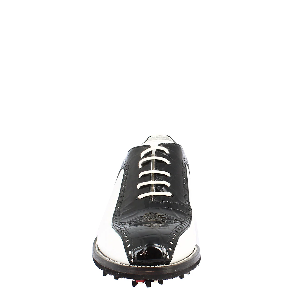 Scarpe golf artigianali in pelle pieno fiore bianco e cocco nero