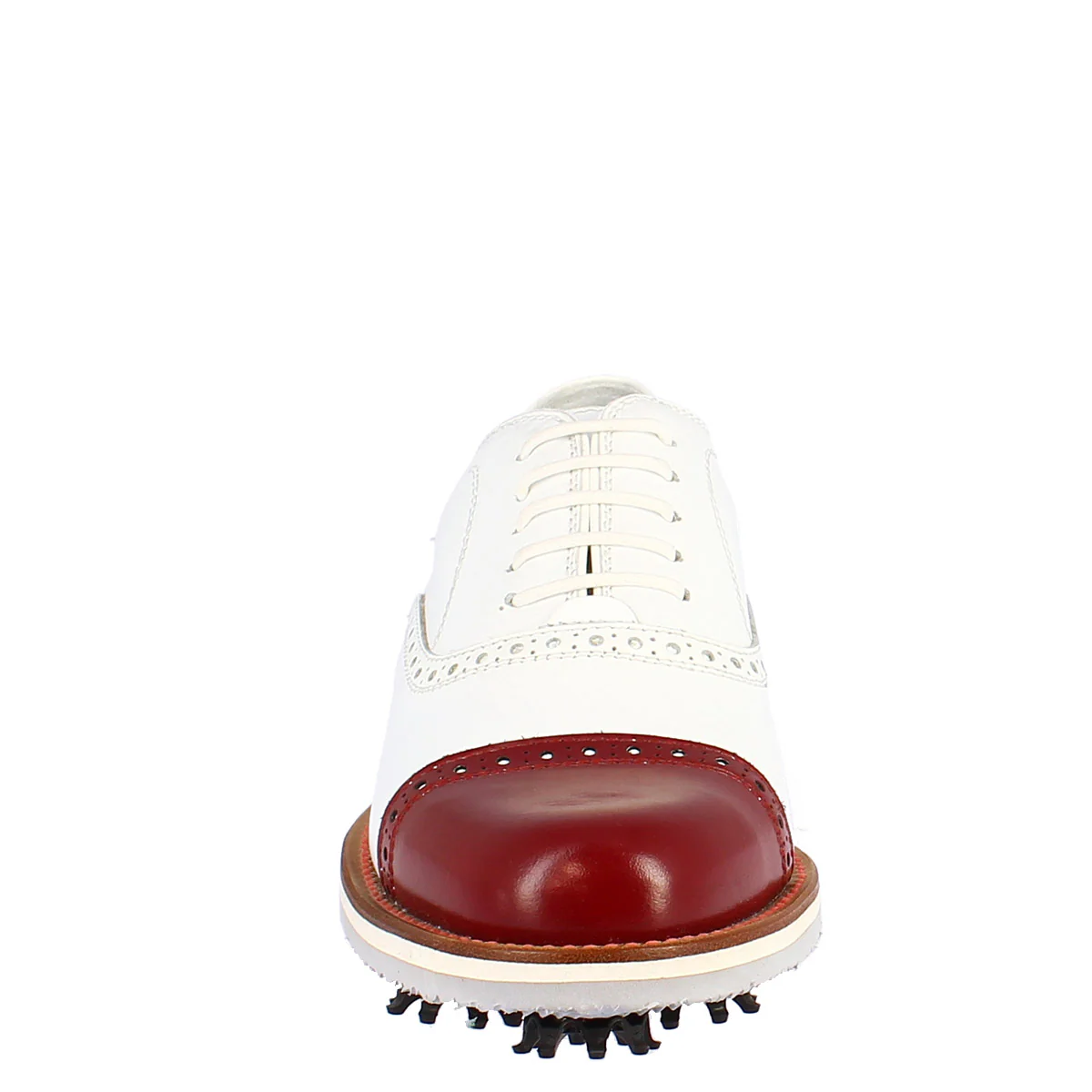 Scarpe golf artigianali in pelle bianco con puntale rosso