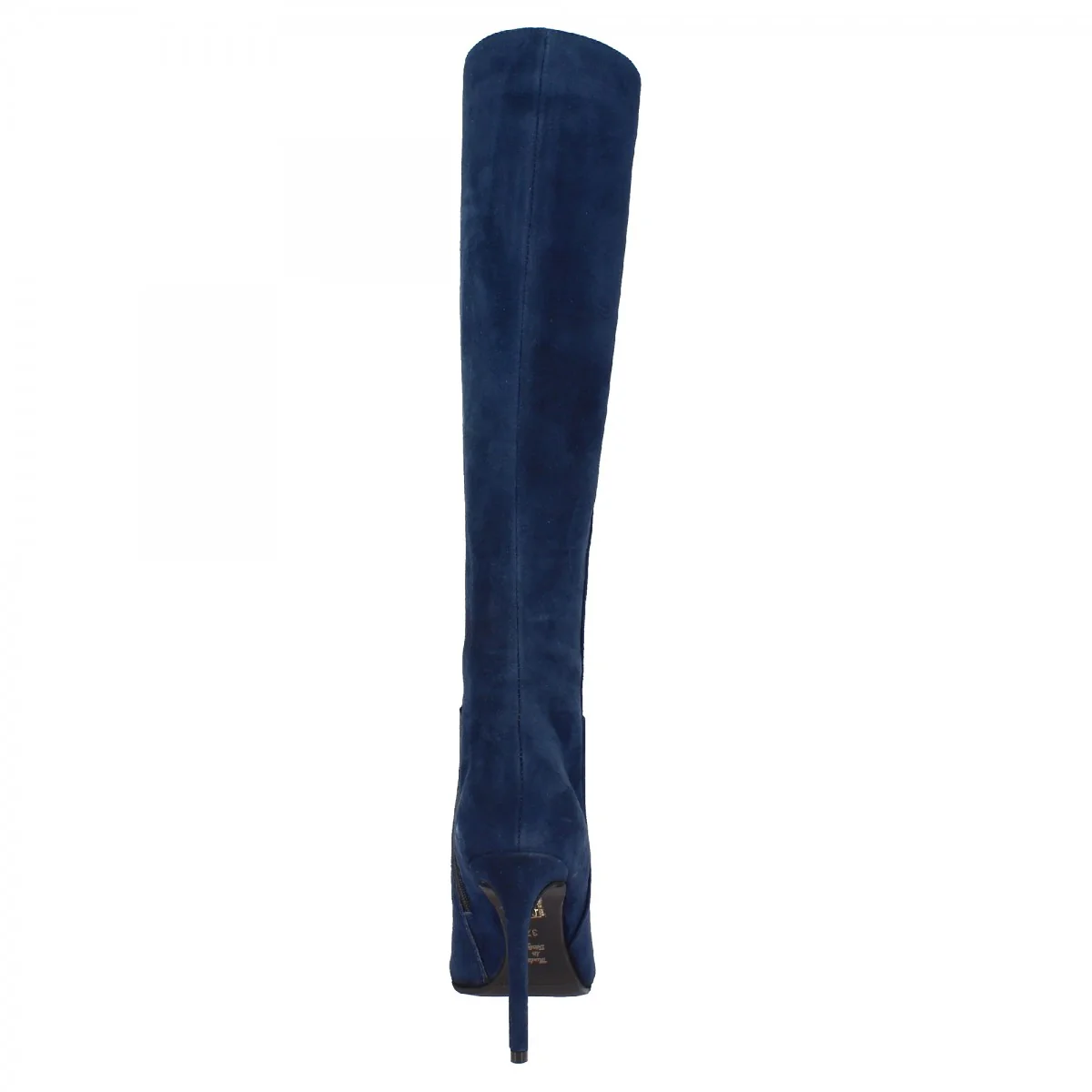 Stivali da donna al ginocchio a punta con tacco a spillo fatti a mano in pelle di camoscio blu